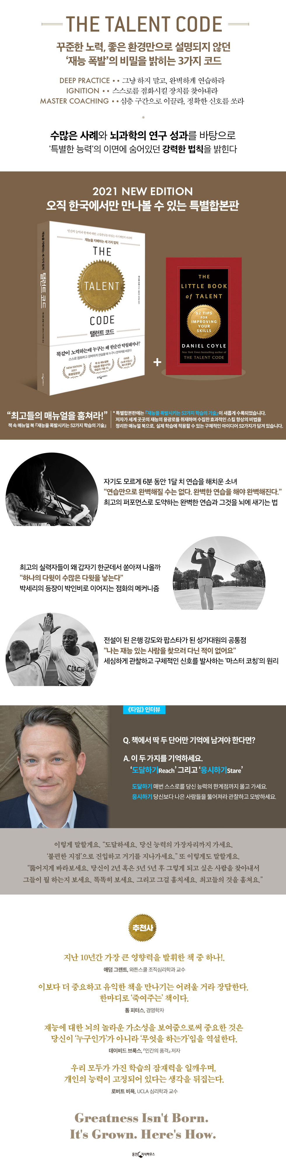 방대한 취재를 바탕으로 하는 『탤런트 코드』는 ‘혁명적인 과학계의 발견을 영리하게 포착한 새로운 자기계발서’라는 평가와 함께 전 세계 독자들의 뜨거운 관심을 받았다. 국내에도 2009년 출간된 이후 독자들의 입소문을 통해 꾸준히 사랑받고 있다.