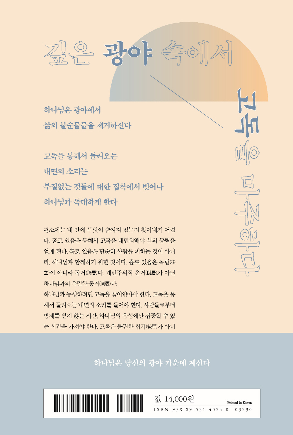 저자는 외로움의 병이 커져가는 세대를 향해 홀로 광야로 들어가라고 말한다. 홀로 있음을 통해서 고독을 마주하라고, 광야 끝에 계신 하나님의 임재 가운데 들어가라고 외친다. 광야는 시험의 장소다. 영적 세계의 필수 코스다. 예수님도 공생애 전 광야의 시험에서 이기셨다.
