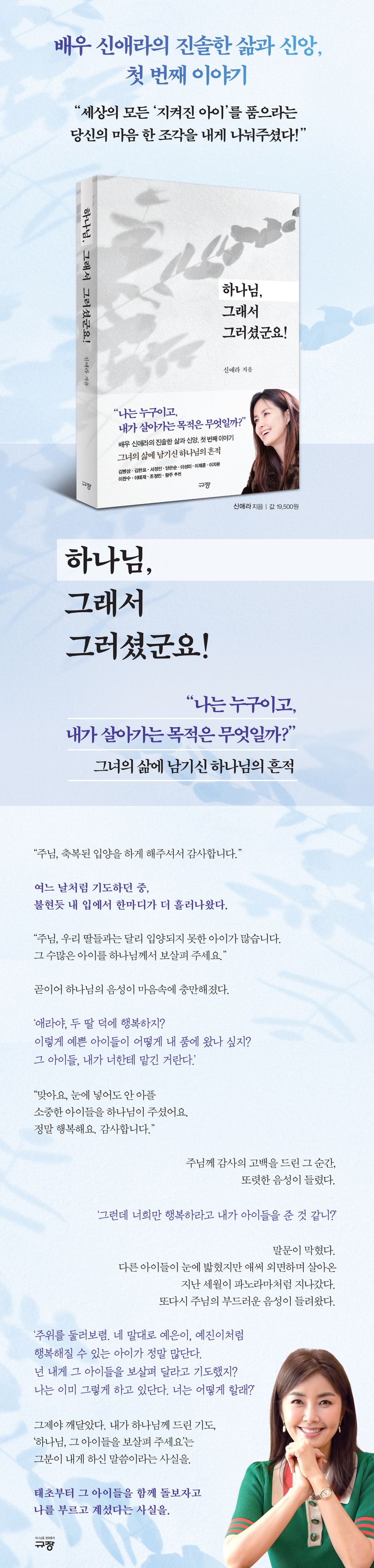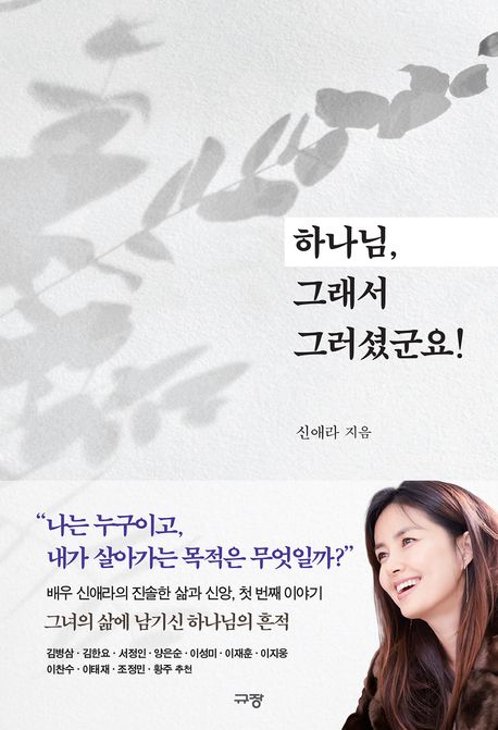 배우, 방송인이자 아내 그리고 삼 남매의 엄마인 신애라의 잔잔하지만 강한 경탄, ‘하나님, 그래서 그러셨군요!’는 믿음, 소망, 사랑의 찬양처럼 들린다. 삶의 흔적을 더듬으며 담담히 써 내려간 글은 그녀가 하나님께 이야기하는 사랑의 고백이다. 그 고백이 마땅히 보호받고 사랑받아야 함에도 그러지 못하는 아이들을 향한 그녀 인생의 목적과 방향이 되었다. 사랑과 관심이 필요한 수많은 아이의 손을 잡으며 이름처럼 사랑(愛)을 널리 펼치는(羅) 그녀는 이 책이 하나님께 올려드리는 ‘인생 전반기 보고서’라고 한다.
