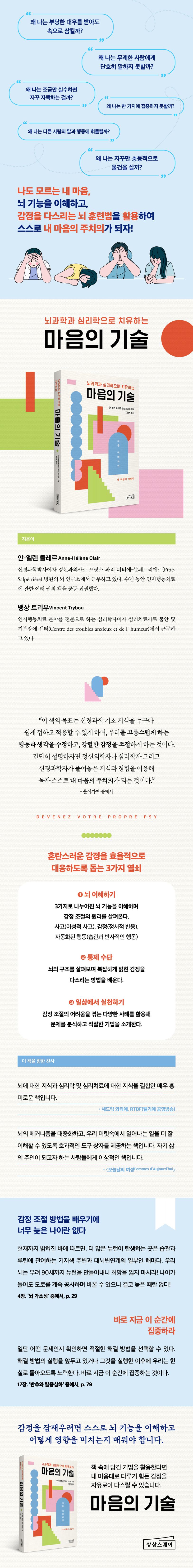 《마음의 기술》은 우리를 고통스럽게 하는 행동과 생각을 수정하고 강렬한 감정을 조절하는 방법을 안내하는 책이다. 그리고 그 방법은 누구나 쉽게 이해하고 적용할 수 있는 신경과학 기초 지식을 바탕으로 한다. 정신과의사이자 신경과학박사인 안-엘렌 클레르와 심리치료사 뱅상 트리부는 뇌가 교육이 가능하며, 뇌의 기능을 이해한다면 누구라도 자신의 뇌를 교육할 수 있다고 말한다. 두 저자가 전하는 지식과 경험을 이용해 독자가 스스로 ‘내 마음의 주치의’가 되는 것이 바로 이 책의 목적이다.