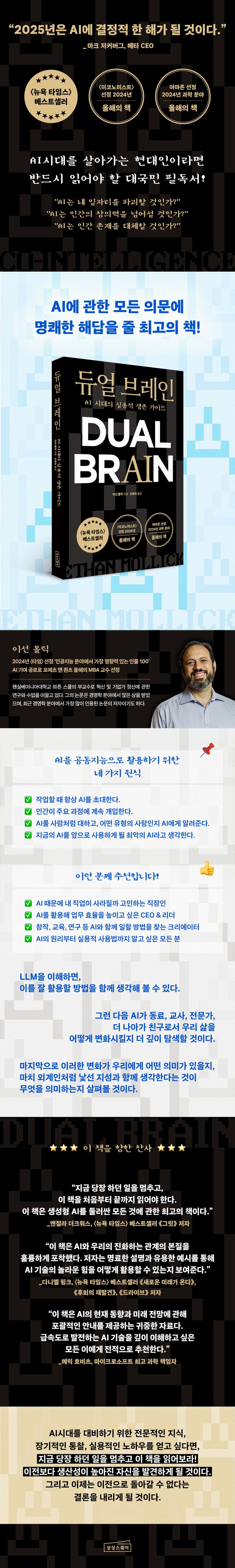 ⟪듀얼 브레인⟫은 AI 시대를 살아가기 위해 꼭 읽어야 할 필독서다. 저자 이선 몰릭은 ⟨타임⟩에서 선정한 ‘인공지능 분야에서 가장 영향력 있는 인물’ 중 한 명이다. 여러 AI 기업에 자문을 제공하고, 와튼 스쿨에서 교육에 AI 활용을 접목하는 등 다양한 영역에서 영향력을 발휘하고 있다. 그런 저자가 생성형 AI를 둘러싼 모든 것에 관한 최고의 책을 집필했다.