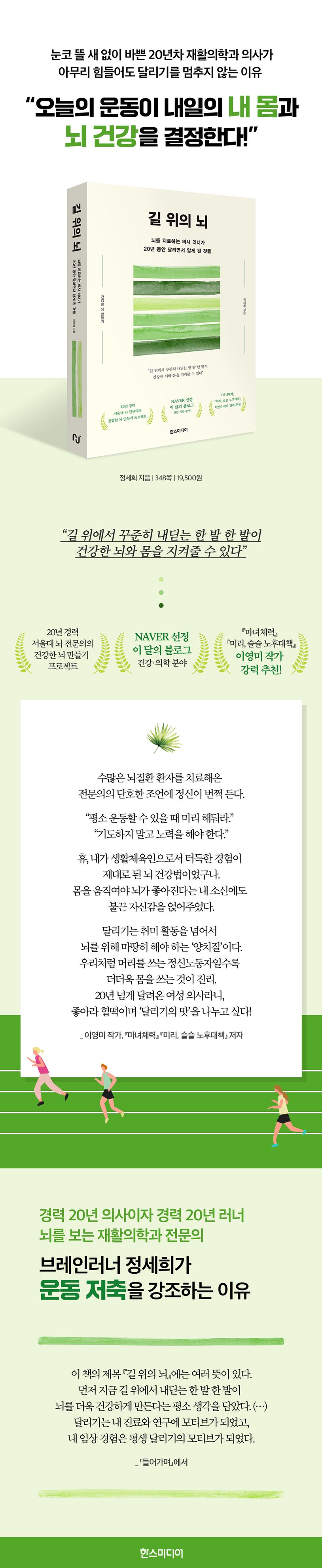 코로나 팬데믹을 전후로 몇 년 사이에 건강과 노화에 대한 젊은층의 관심이 급증했다. 건강한 음식을 먹고 술과 담배를 멀리하며 규칙적인 생활을 하려는 이들에게 필수적인 또 하나의 요소는 바로 ‘운동’이다. 최근까지 MZ세대 사이에서도 유행한 골프와 같이 사교 활동을 목적으로 한 스포츠도 있지만, PT나 러닝, 수영처럼 순전히 체력과 근력을 단련하는 운동에 대한 관심과 선호도 높다. 그중에서 달리기, 즉 러닝은 혼자서도 또는 여러 사람과 모여 크루를 형성해서 할 수도 있는 운동이라 특히 인기가 있다. 런데이 앱이니 러닝 크루니 이러한 것들은 전혀 없었던 20년 전부터 달리기를 해온 서울대 재활의학과 정세희 교수는 새내기 의사 시절부터 러너로도 경력을 쌓았다. 의사로서 보낸 시간과 러너로서 달린 시간이 거의 일치하는 셈이다. 달리기와 운동, 뇌 이야기를 전하는 저자의 블로그는 네이버 선정 이달의 블로그에도 뽑혔을 정도로 알찬 내용을 담고 있기도 하다. 바쁘기로 소문난 의사가 어떻게, 그리고 왜 달리기를 멈추지 않았던 걸까? 그리고 왜 자신을 찾아오는 환자들과 수천 명에 달하는 블로그 구독자들 또 이 책 『길 위의 뇌』를 집어들 독자들에게 달리기를 비롯한 운동을 절대 거르지 말고 꾸준히 쌓아야 한다고 강조하는 걸까? 뇌를 보는 의사, ‘브레인러너’ 정세희에게 운동은 단지 취미 활동이나 체력 단련을 넘어서는 것이기 때문이다.