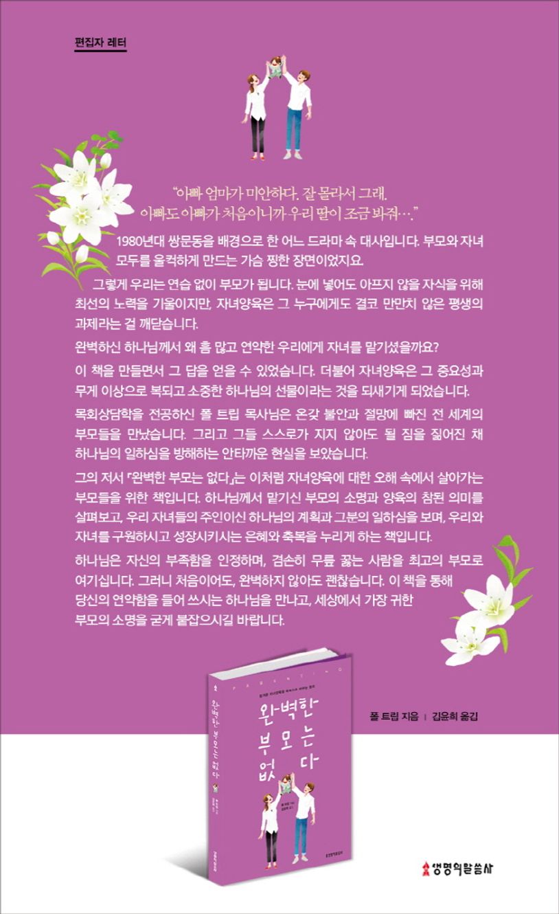 [완벽한 부모는 없다]는 자녀양육에 지친 부모들에게 부모의 본질적인 임무와 양육의 참된 의미를 알려주는 길라잡이 같은 책이다. 본서를 통해 그는 하나님의 창조섭리와 자녀양육의 실제적인 도움 및 부모들이 누려야 할 참자유와 은혜를 전한다. 또한 그 어떤 부모에게도 자녀를 변화시킬 능력이 없음을 인정하며 자신의 힘으로 자녀들을 무언가로 만들어내려는 고집을 버릴 때 양육의 새로운 지평을 발견하게 될 것이라 충고한다. 이 책에 담긴 본질적이고도 구체적인 14가지 원칙이 양육에 지친 부모들에게 참소망과 실제적인 위로를 전할 것이다. 또한 하나님과의 관계, 자녀와의 관계 회복으로 가정에 많은 변화를 가져다줄 것이다.
