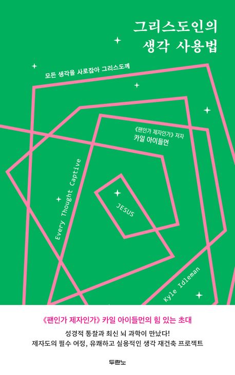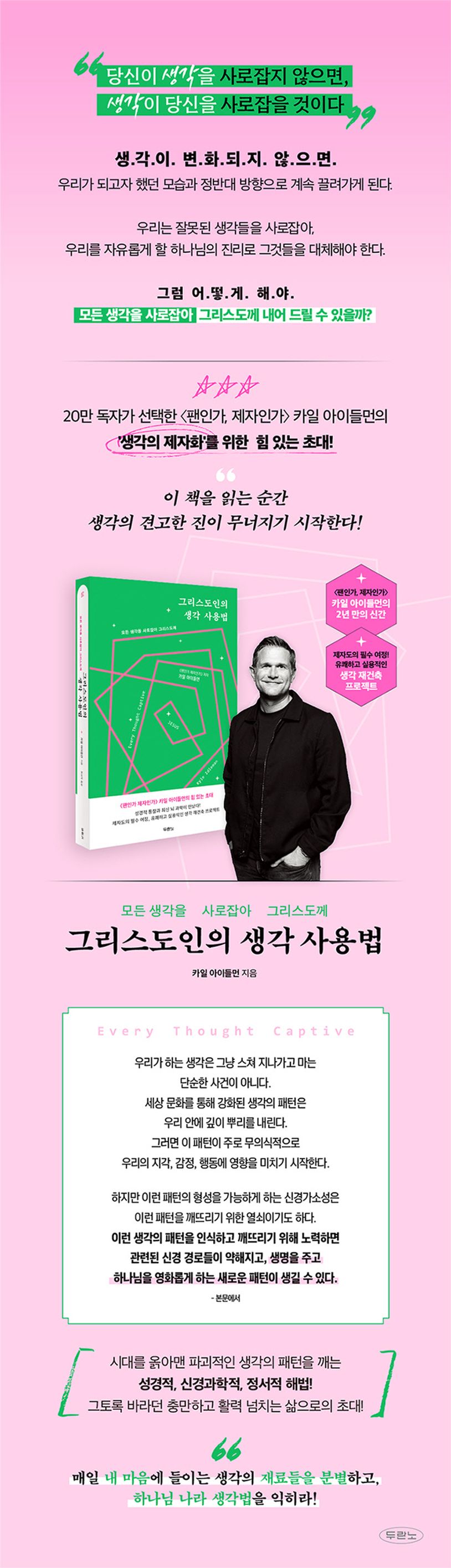 미국의 손꼽히는 대형 교회 중 하나인 사우스이스트크리스천교회(Southeast Christian Church)의 담임목사이자, 베스트셀러 《팬인가, 제자인가》로 널리 알려진 카일 아이들먼은 ‘올바른 생각’이 자신을 포함해 수많은 사람들의 인생을 변화시키는 힘을 목격했다. 그리하여 그 귀한 경험과 통찰을 이 책, 《그리스도인의 생각 사용법》에 담아냈다. 마음 전쟁에서 패하고 낙담한 신자들을 위해 살아 있는 성경과 최신 뇌 과학, 심리학 자료를 탁월하게 엮어 풍성한 조언을 건넨다.